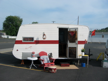 The view lot still had room for more trailers, so sometimes GCG's friend Miss Shelley would bring her trailer, and spend the weekend at what quickly came to be dubbed 'Girl Camp,' with a funky hand-lettered sign adorned with two china plates--just to underscore the 'girly' part.